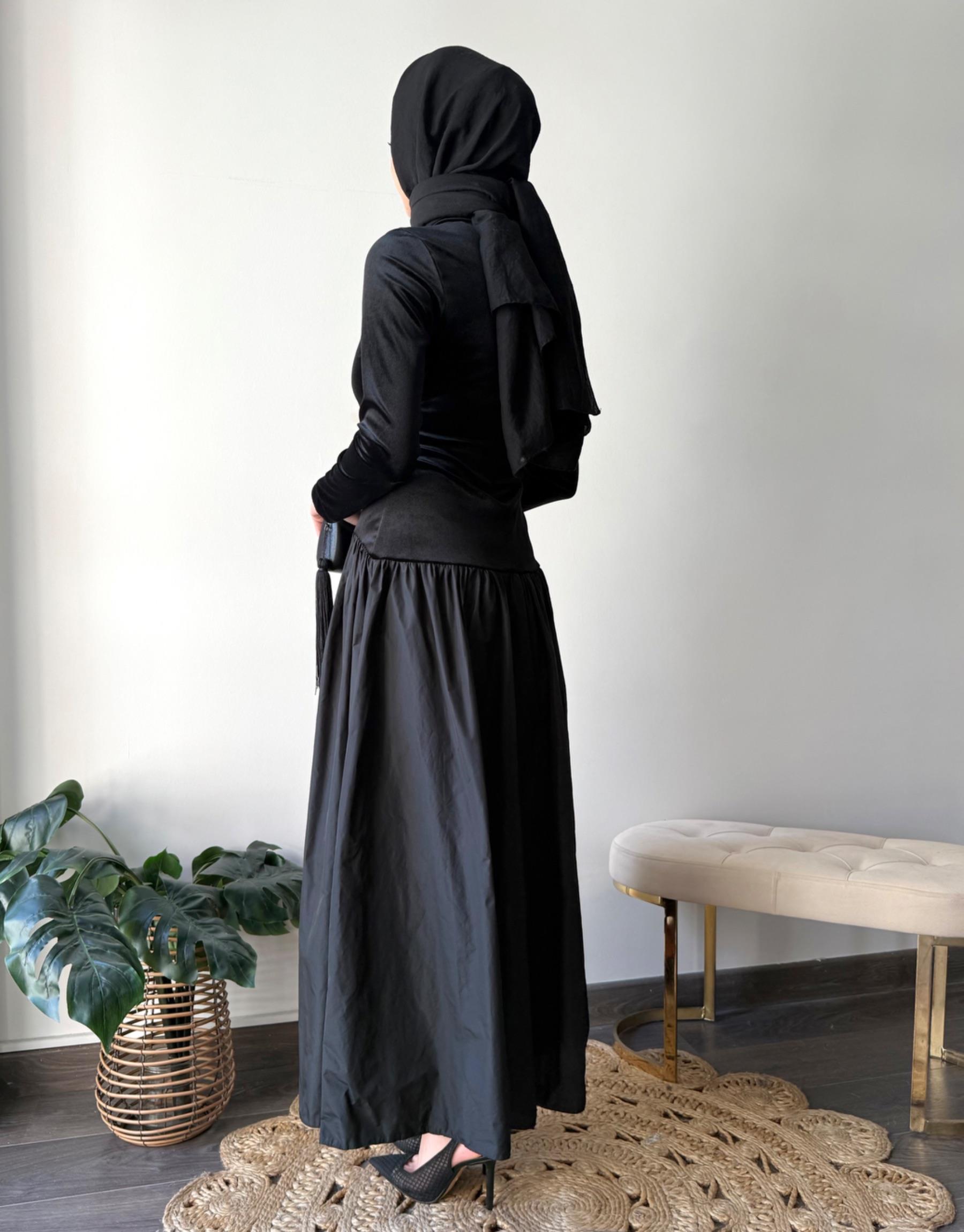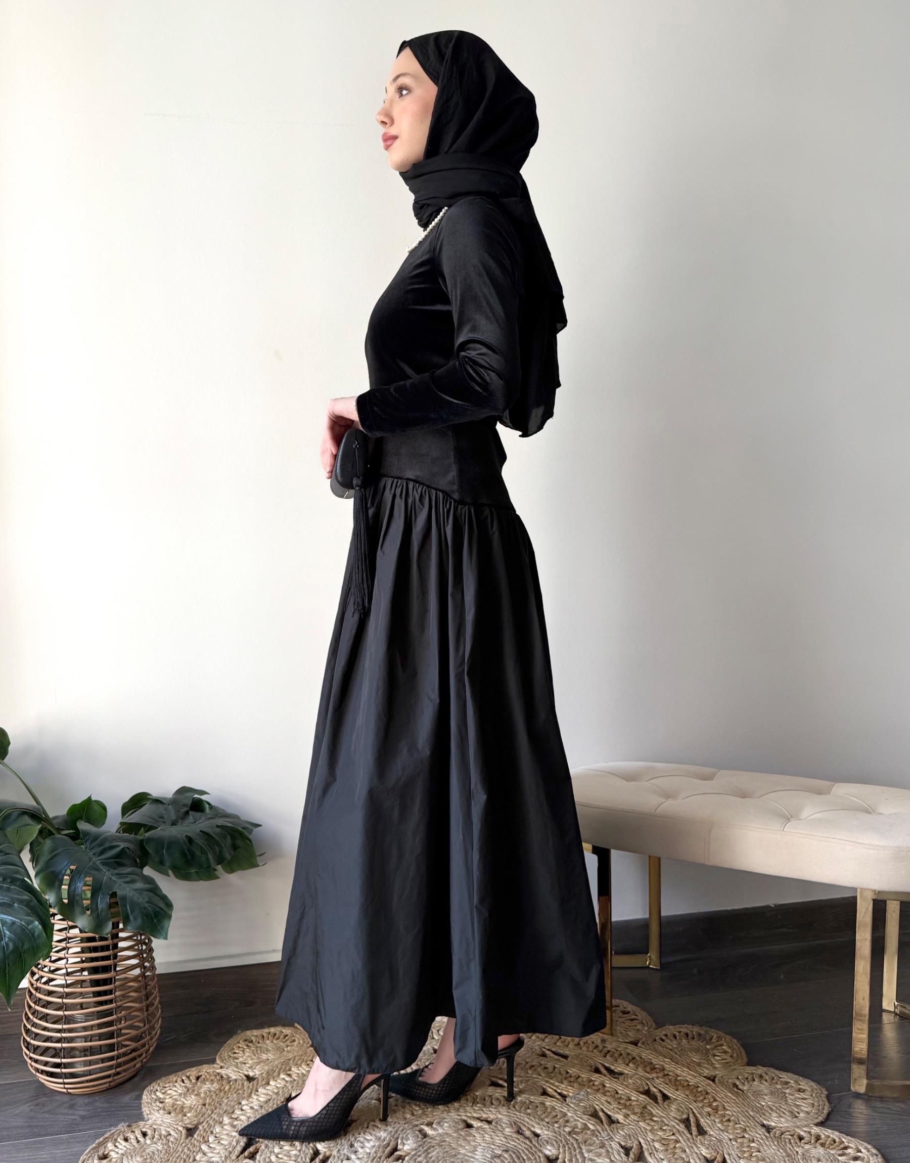 Üst kısım esnek kadife kumaş etek kısmı tafta kumaş